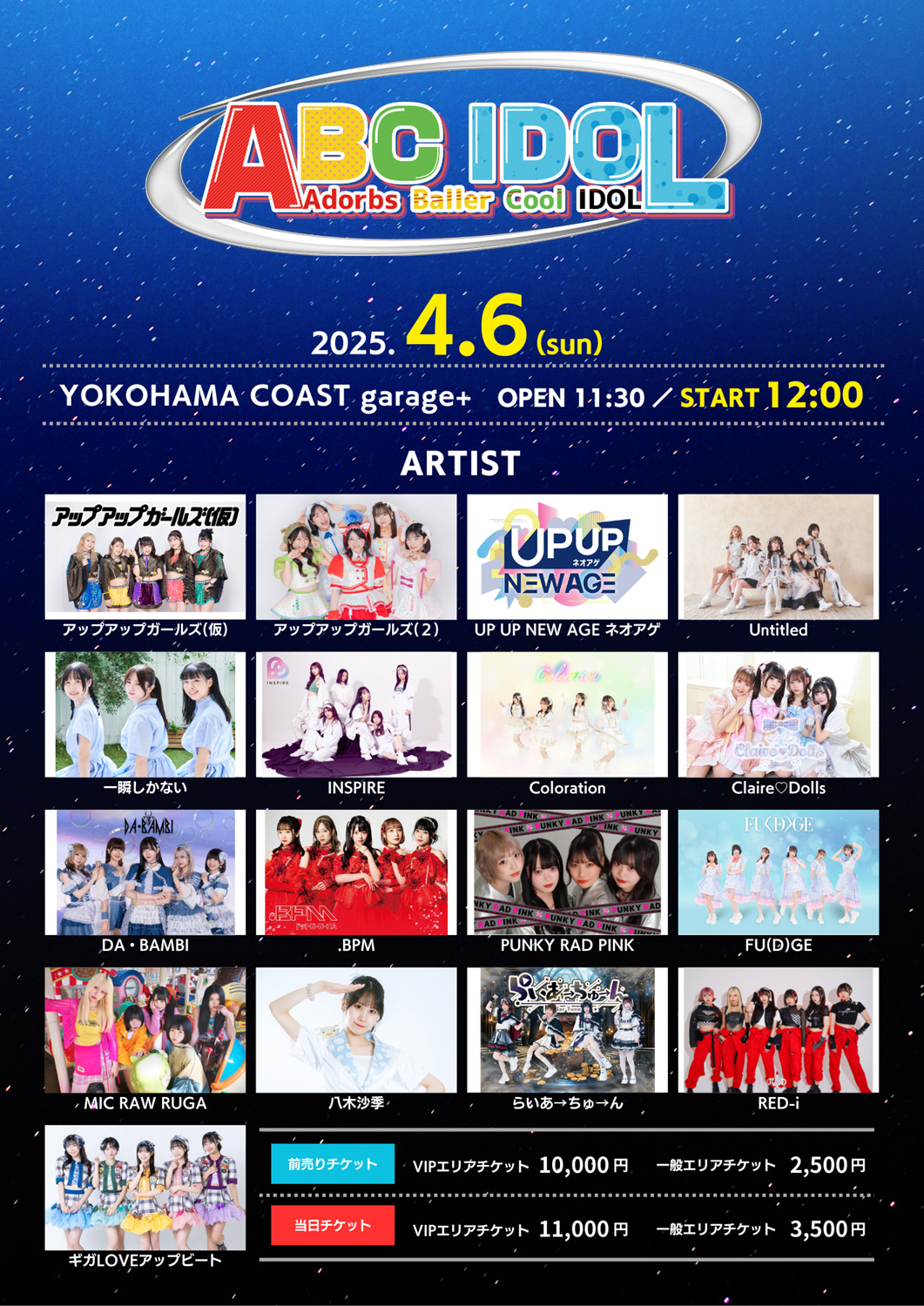 入場チケット:前売VIPエリアチケット10000円(+D) / 前売一般2500円 / 当日VIPエリアチケット11000円(+D) / 当日3500円(+D)