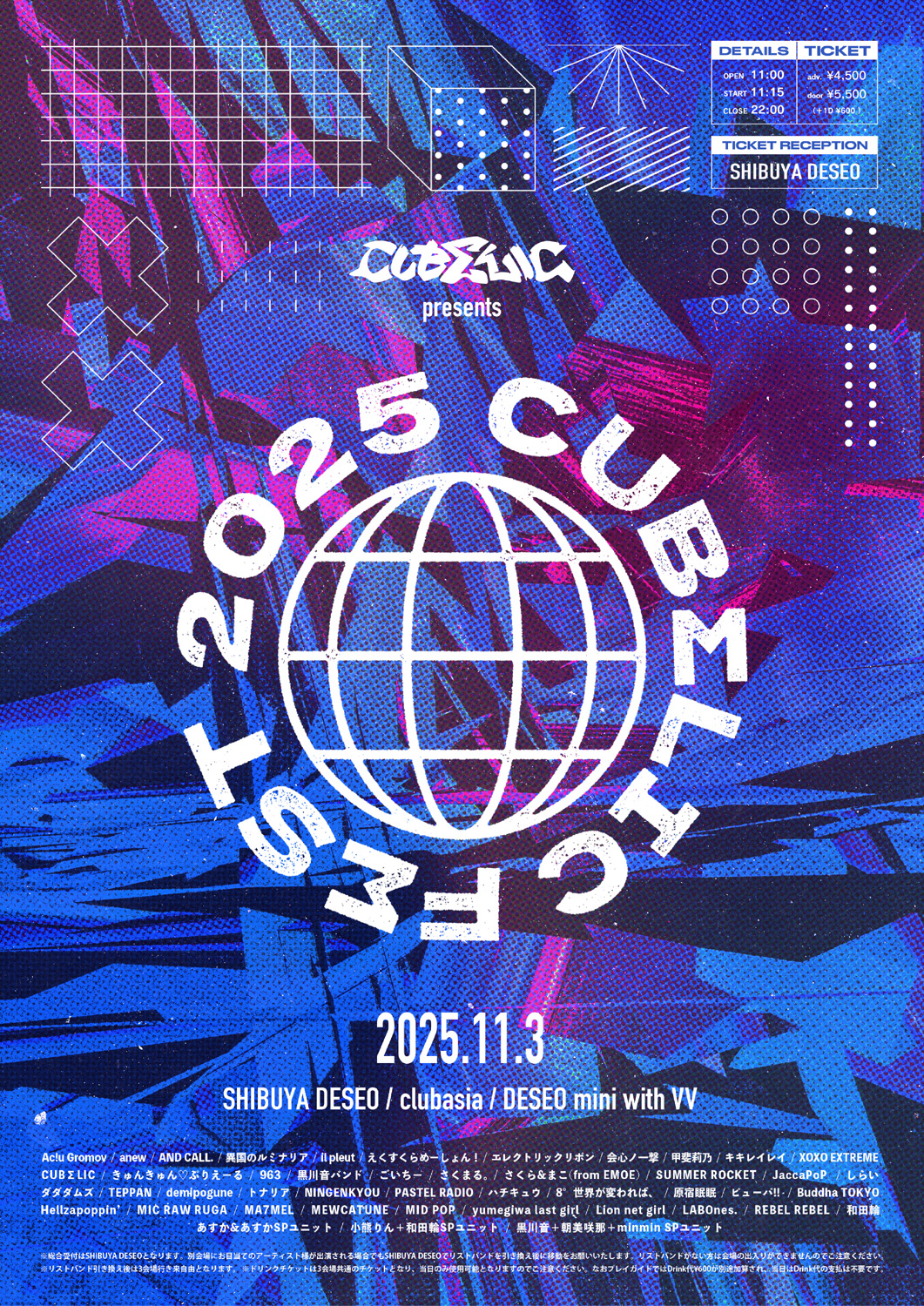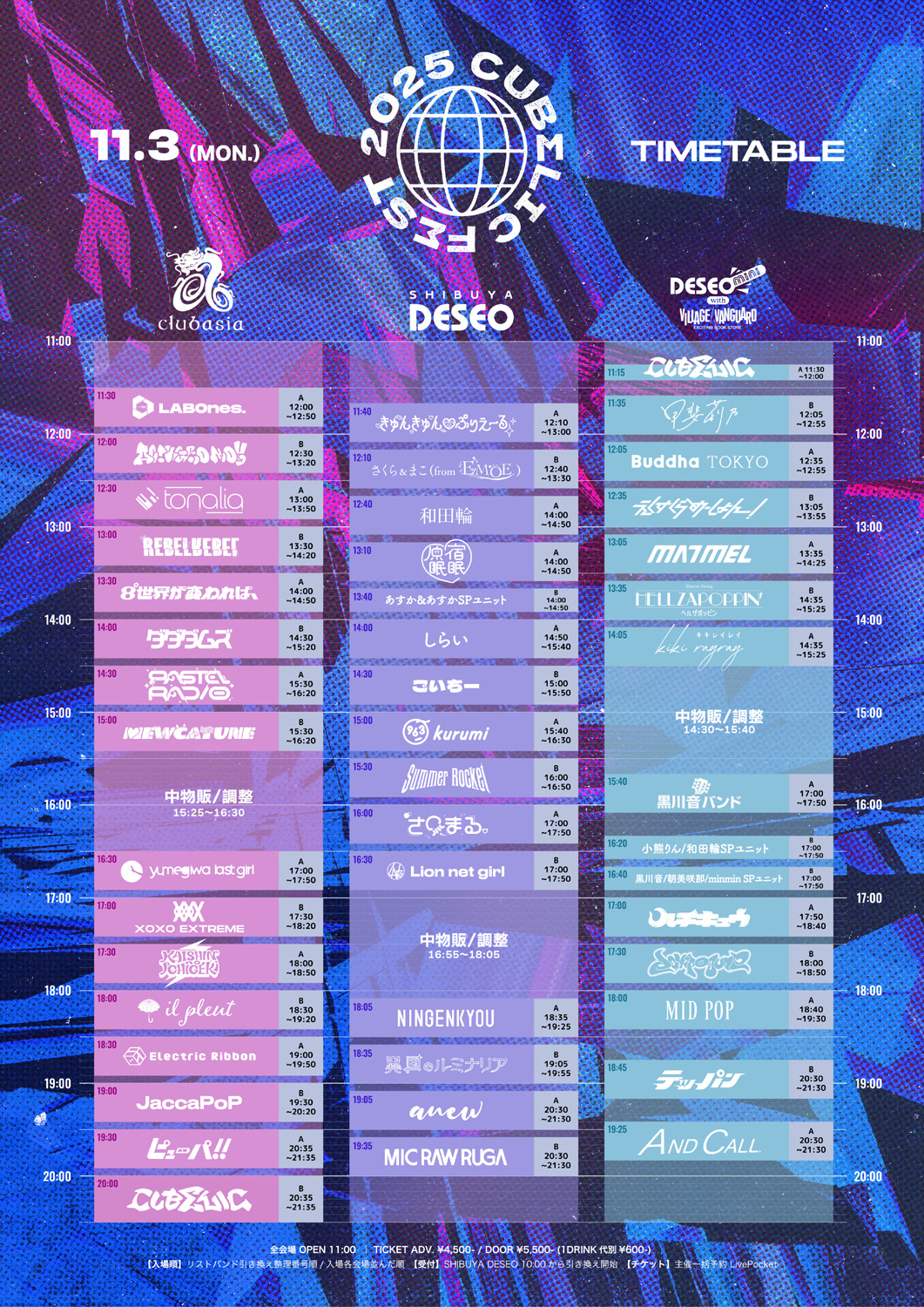 会場:渋谷 club asia(東京都渋谷区円山町 1-8) / DESEO(東京都渋谷区道玄坂2-13-5 ハーベストビルディングB1F) / DESEO mini with VILLAGE VANGUARD(東京都渋谷区道玄坂2-13-5 ハーベストビルディング2F)