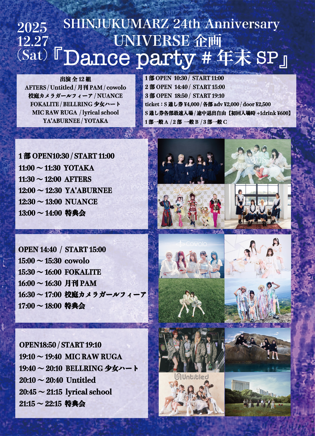 入場チケット:S通し4000円(+D) / 各部前売2000円(+D) / 当日2500円(+D)