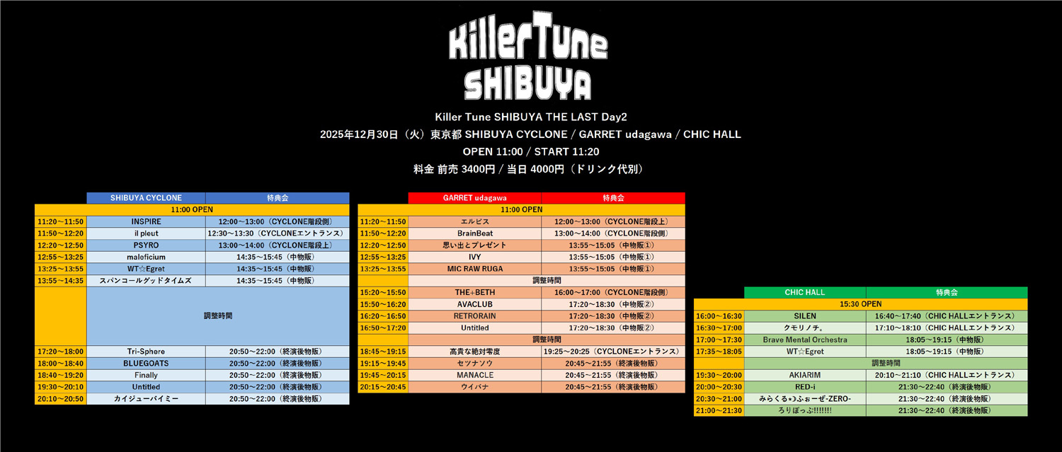 会場:SHIBUYA CYCLONE(東京都渋谷区宇田川町13-16 国際ビルA館B2) / GARRET udagawa(東京都渋谷区宇田川町13-16 国際ビルB館B1) / CHIC HALL(東京都渋谷区宇田川町3-7 B1) ※3会場サーキットイベント