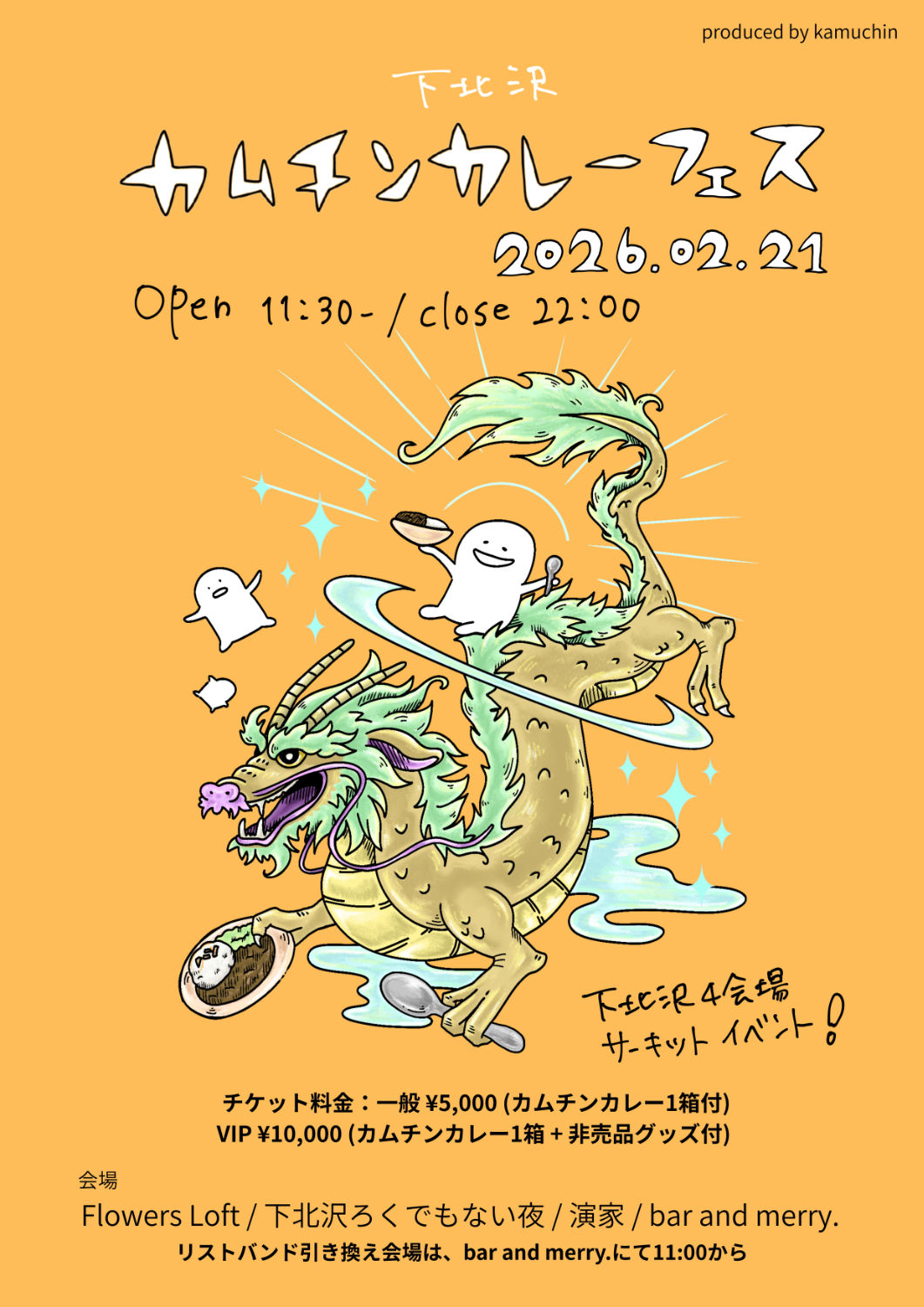 入場チケット:一般5000円(カムチンカレー1箱付き) / VIP:10000円(カムチンカレー1箱+非売品Tシャツ付き)