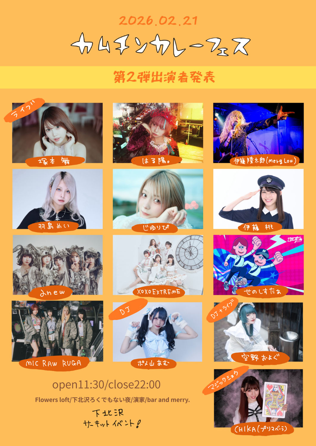 会場:下北沢ろくでもない夜(東京都世田谷区北沢2-6-5 ルイビル3F) / Flowers Loft(東京都世田谷区北沢2-24-5 SHIMOKITA FRONT B1) / 演家(東京都世田谷区北沢2-14-2 JOW3ビル4F) / Bar and merry.(東京都世田谷区北沢2-12-2 サウスウェーブ下北沢2A号)