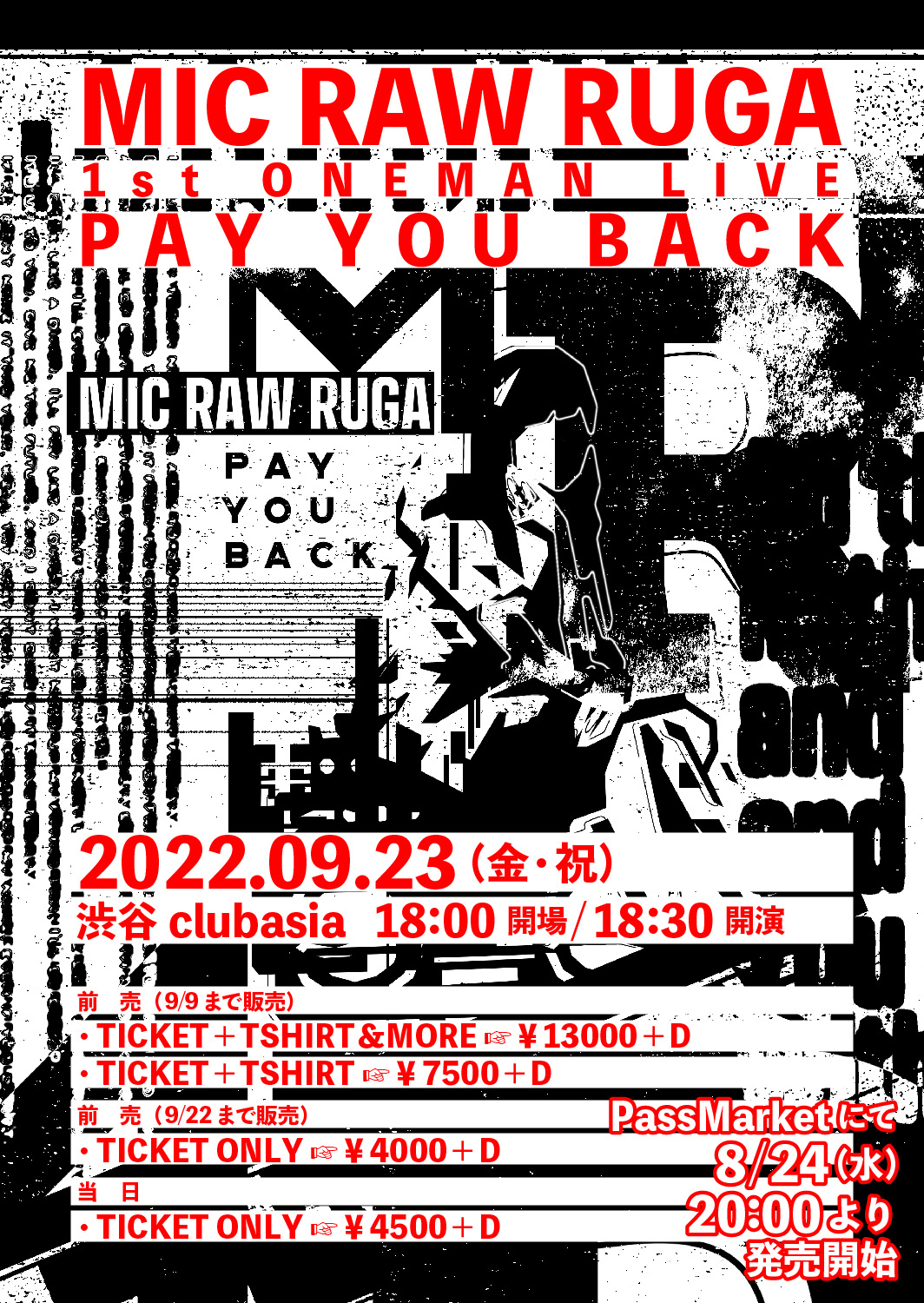 MIC RAW RUGA 1st ONEMAN LIVE「PAY YOU BACK」を、9/23(金祝)夜、渋谷club asiaにて開催します。