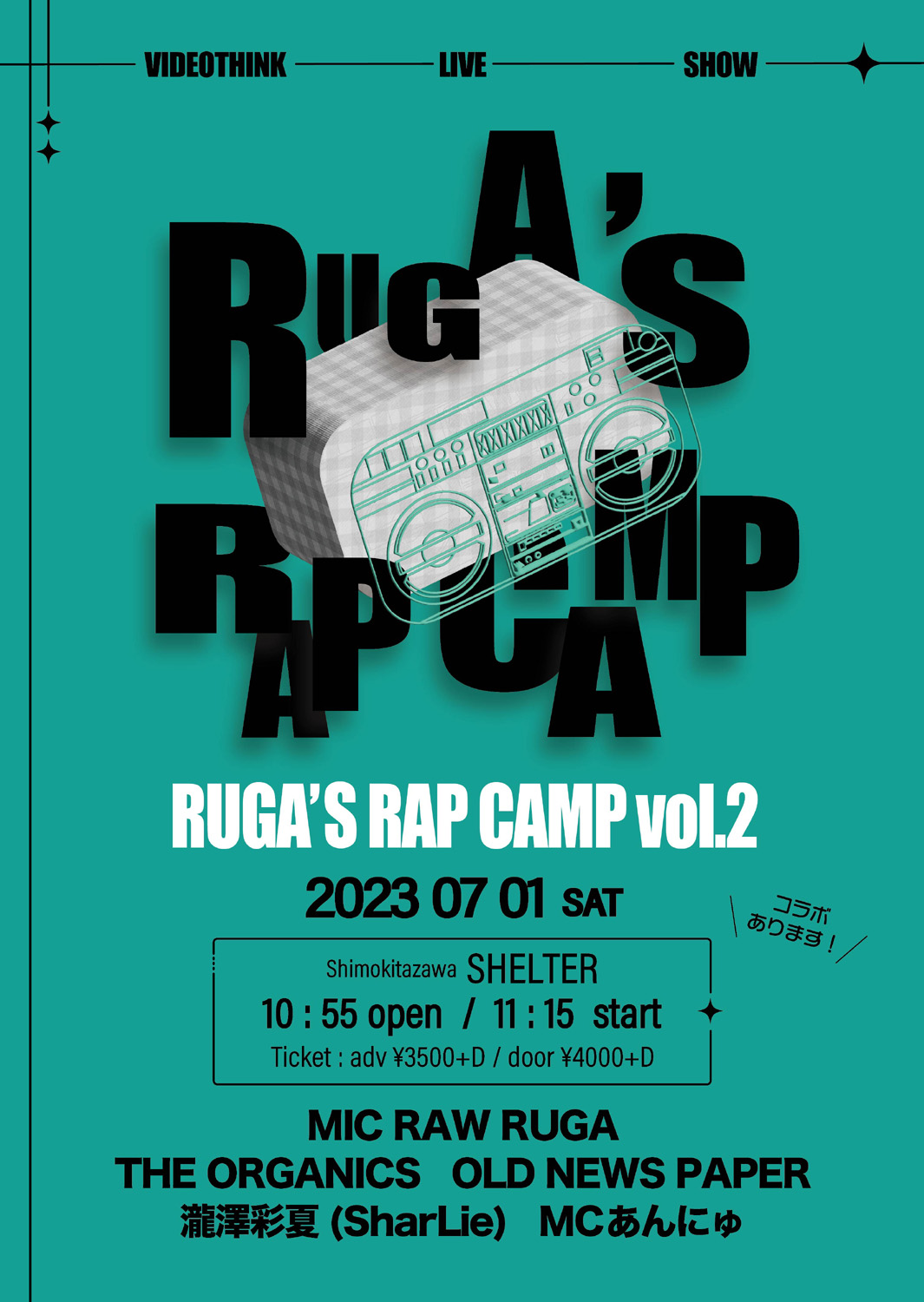 女性ラップグループ、アーティスト限定の定例ライブ「RUGA’S RAP CAMP vol.2」を2023年7月1日(日)11:15~、下北沢SHELTERにて開催します。ゲストはOLD NEWS PAPERさん、THE ORGANICSさん、瀧澤彩夏(SharLie)さん、MCあんにゅさん。MIC RAW RUGAとTHE ORGANICSさん、OLD NEWS PAPERさんとTHE ORGANICSさんがコラボを披露します。