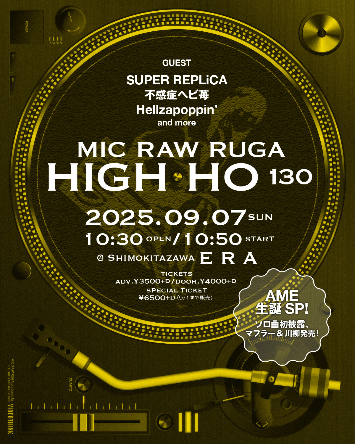 2025年9月7日(日)10:50~、下北沢ERAにて、定期公演「HIGH-HO vol.130 AME生誕SP」を開催することが決定しました。ゲストはSUPER REPLiCAさん、不感症ヘビ苺さん、Hellzapoppin’さん、他となります。